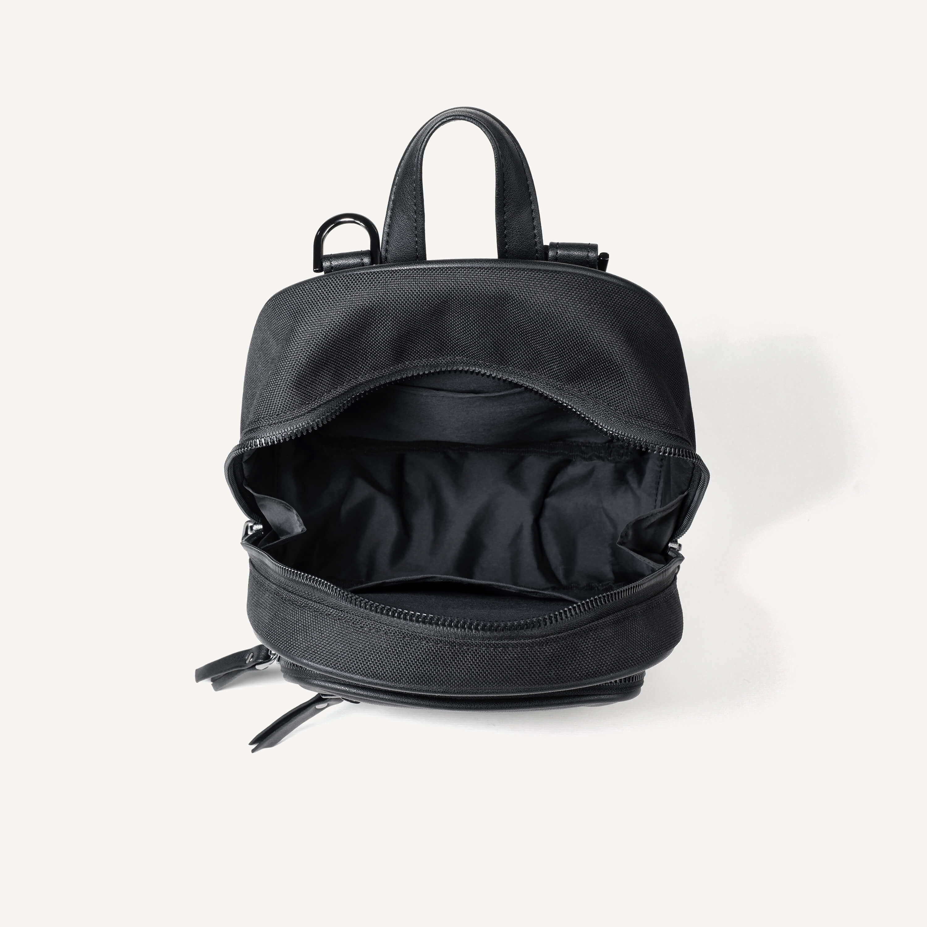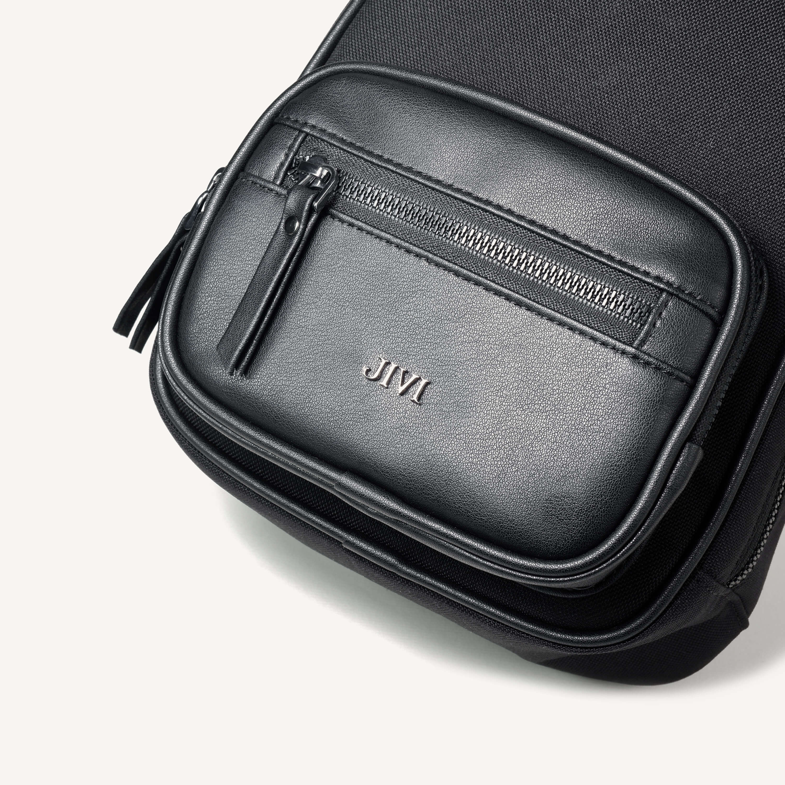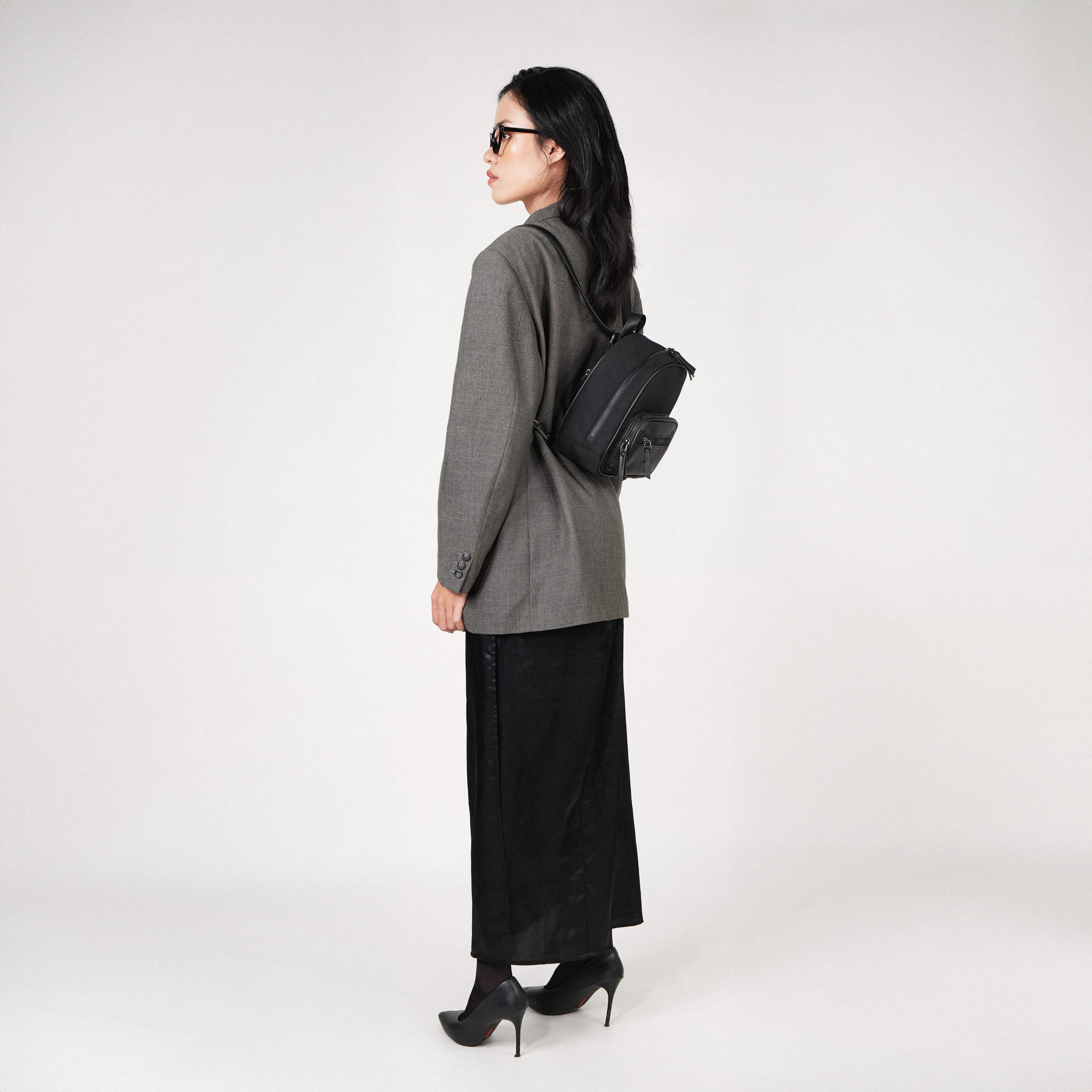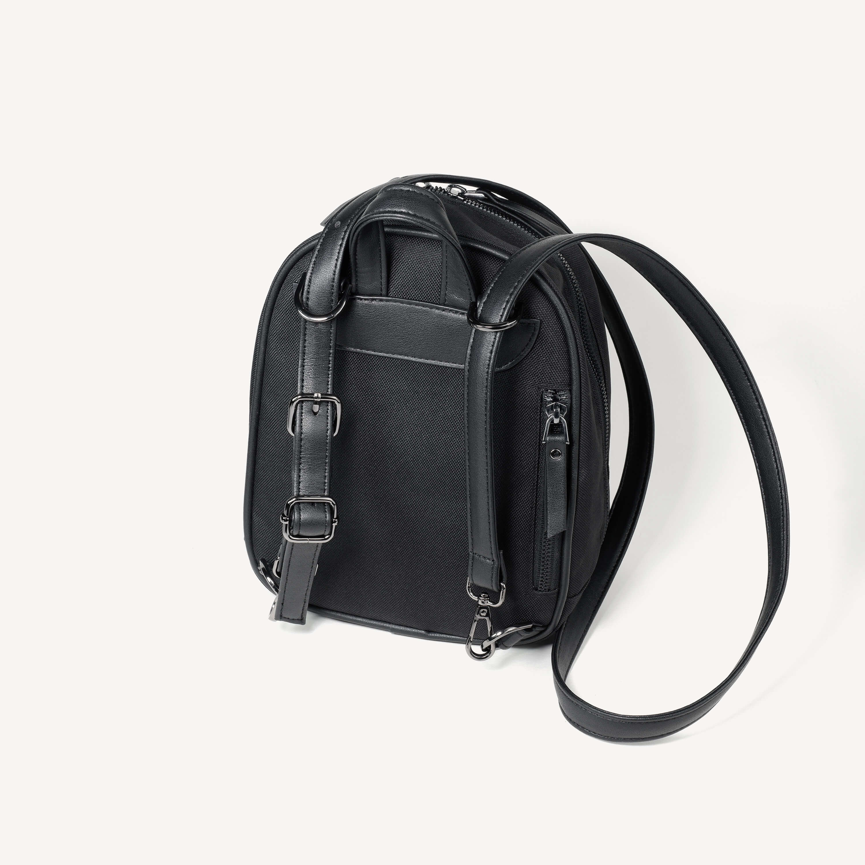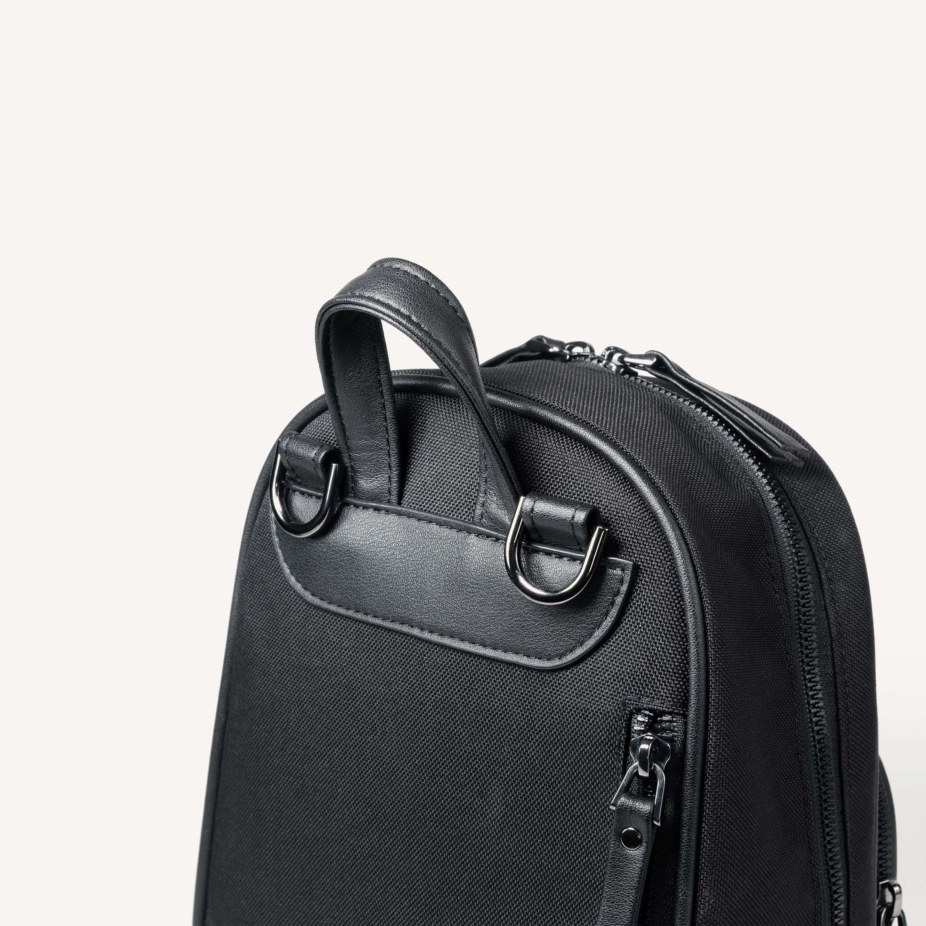 Besides, the design also exploits the contrast between two materials (microfiber leather and canvas polyester), the softness of each edge detail, the handmade zipper pulls and the sharpness of high-quality molded Atimol accessories.